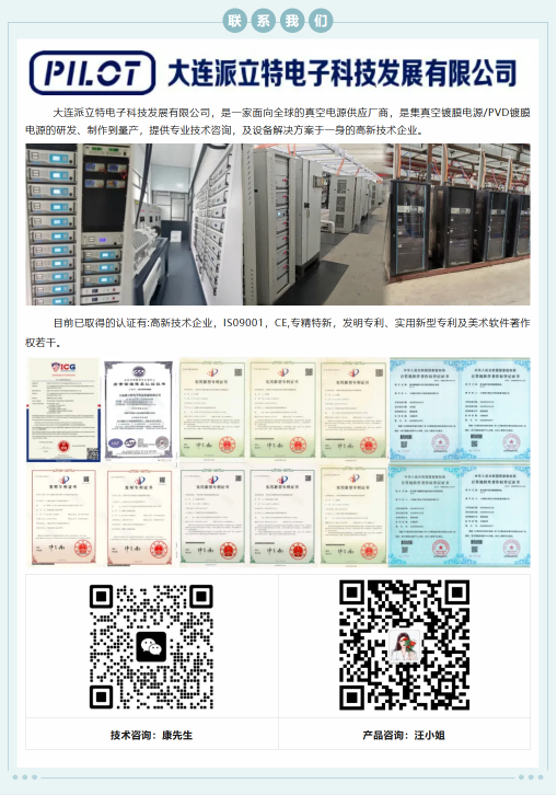 大連派立特電子科技發(fā)展有限公司,是一家面向全球的真空電源供應廠商,是集真空鍍膜電源/PVD鍍膜電源的研發(fā)、制作到量產(chǎn),提供專業(yè)技術咨詢,及設備解決方案于一身的高新技術企業(yè)。 主要在售電源品類如下,已廣泛應用于諸多業(yè)內頭部企業(yè)并得到高度認可,支持按需定制: 多弧電源 燈絲電源 清洗電源 轟擊電源 靜電吸附電源 脈沖弧電源 中頻濺射電源 脈沖偏壓電源 離子源電源 直流磁控濺射電源 直流脈沖濺射電源 and so on... 目前已取得的認證有:高新技術企業(yè),ISO9001,CE,專精特新,發(fā)明專利、實用新型專利及美術、軟件著作權若干。